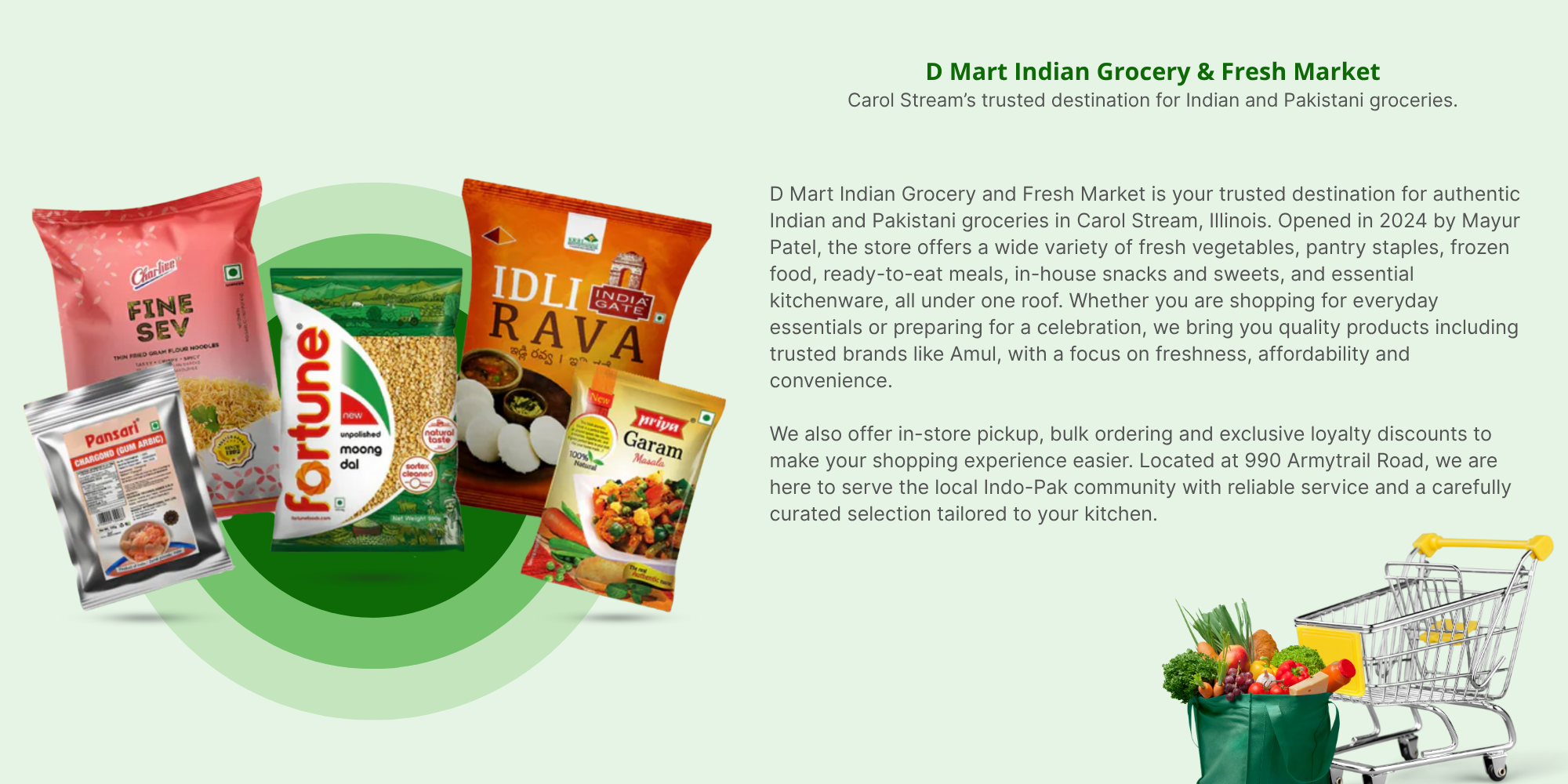 Opened in 2024, D Mart offers a wide range of products, including fresh produce, frozen meals, pantry staples, and popular brands such as Amul and Aashirvaad, along with carefully selected Pakistani products. We are committed to delivering quality, convenience, and meeting the everyday grocery needs of our community.